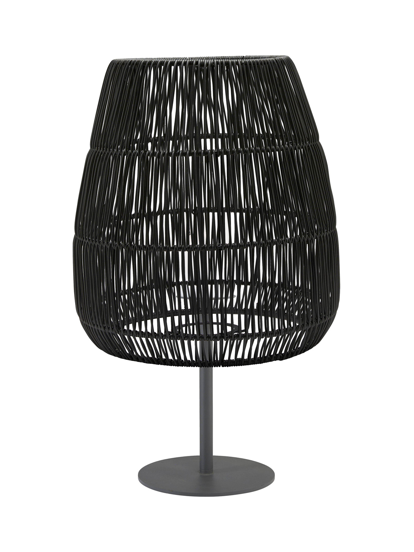Table lamp Agnar including the shade Saigon in black, both which are suitable for outdoor use. The base has an E27 lamp holder and needs a light source with E27 bracket that is adapted for outdoor use, we recommend the light source 1806404. There is a white plastic lid and a gasket covering the light source and lamp holder that protects against moisture. The lampshade has a braided pattern that creates beautiful rays of light. It is made of artificial rattan which is a weather-resistant material. The screen is attached to the lamp base using a special bracket. Base height 50 cm, shade height 40 cm.