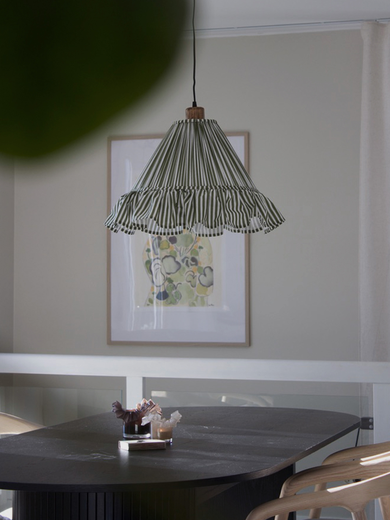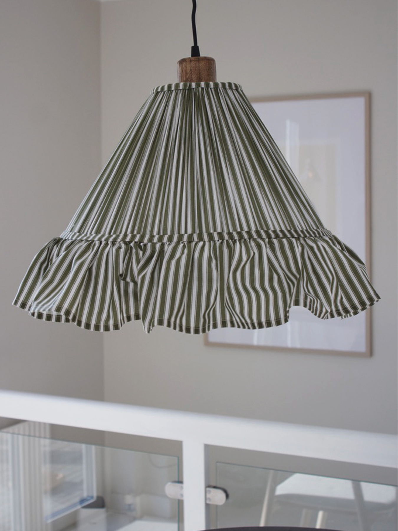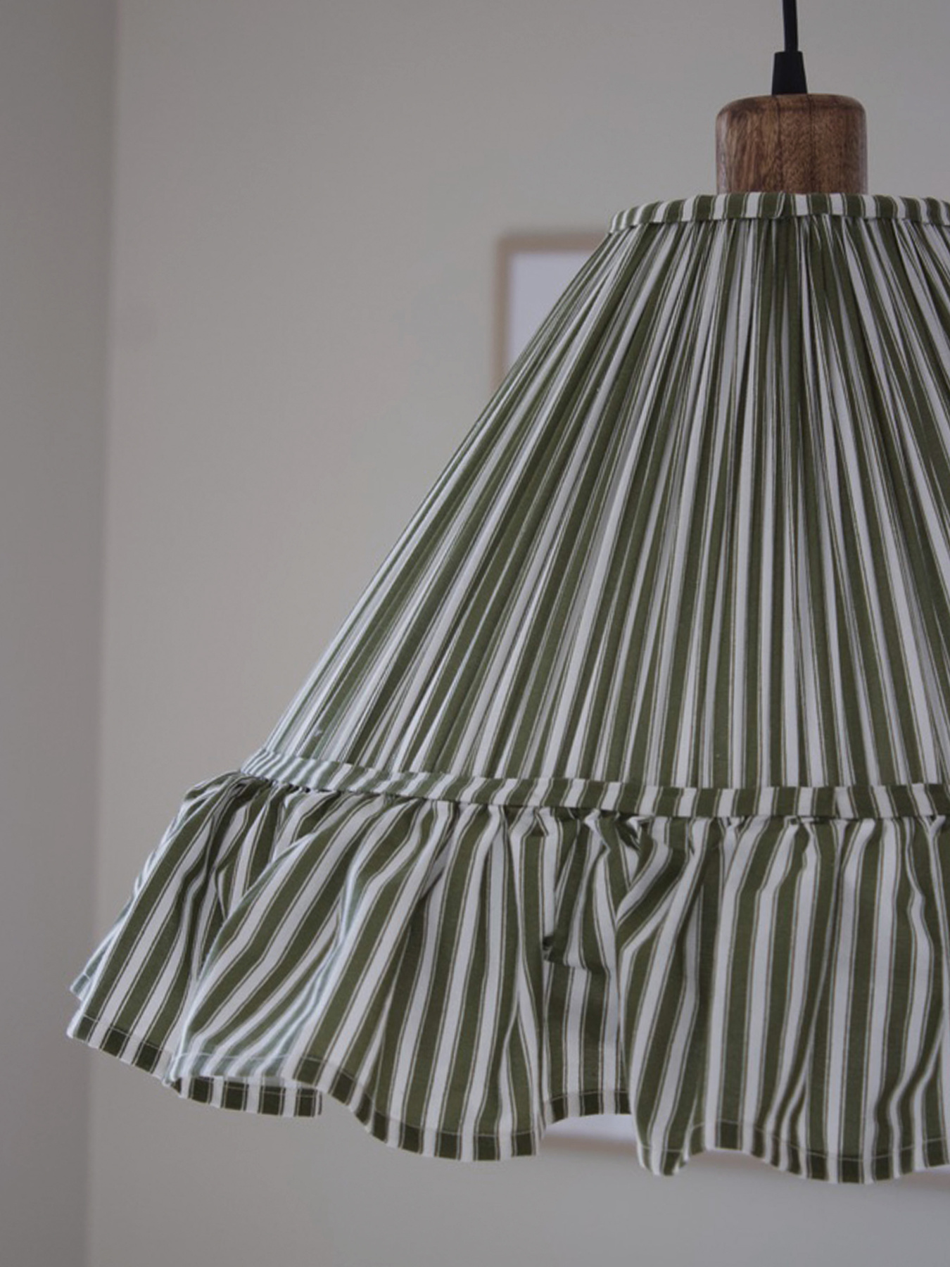 Pendant lamp Estrid is a shade dressed in stripes fabric, with a slightly conical shape and a ruffle skirt around the bottom. The bottom diameter is 40cm, the top is 13cm and the height is 22cm height (excl the skirt). The shade has a E27 lamp holder. We recommend to use a LED bulb, max 25W. Canopy in mango wood is included. Bulb is not included.