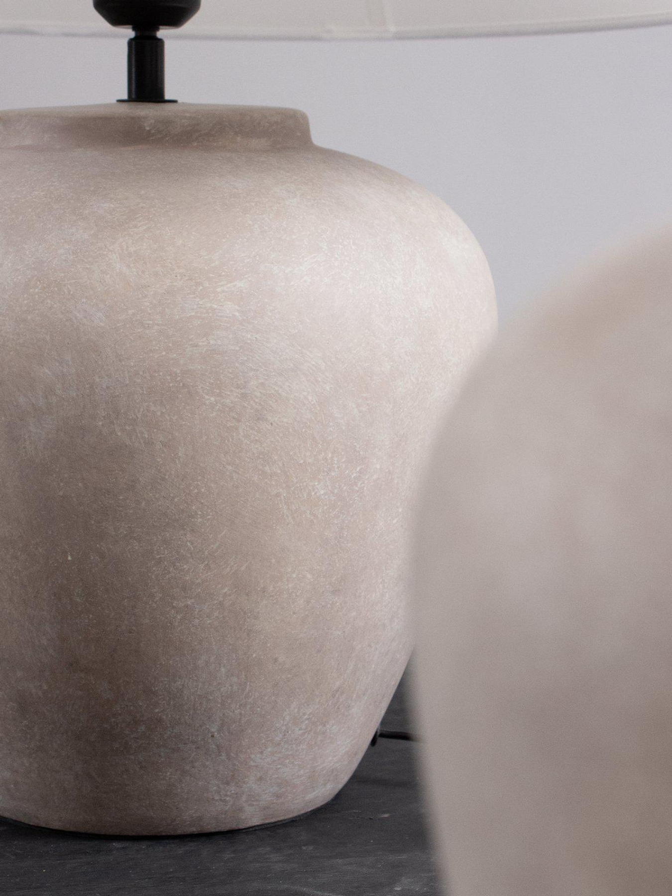 Lilly Ceramic Table Lamp. The table lamp is handmade and designed with beautiful urn shape. The vintage and sculptured effect makes each lamp unique, therefore finish might vary between the lamp on the image and the one that you will receive. It has a linen shade with a conical shape. Black cord with switch and EU wall plug. E27 lamp holder. The lamp head is articulated for horizontal adjustment of the lamp shade. Max 40W. IP20. The total height of the lamp is 41cm and the diameter of the shade is 35cm. Light source is purchased separately.