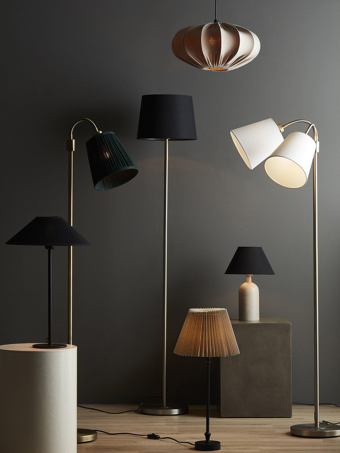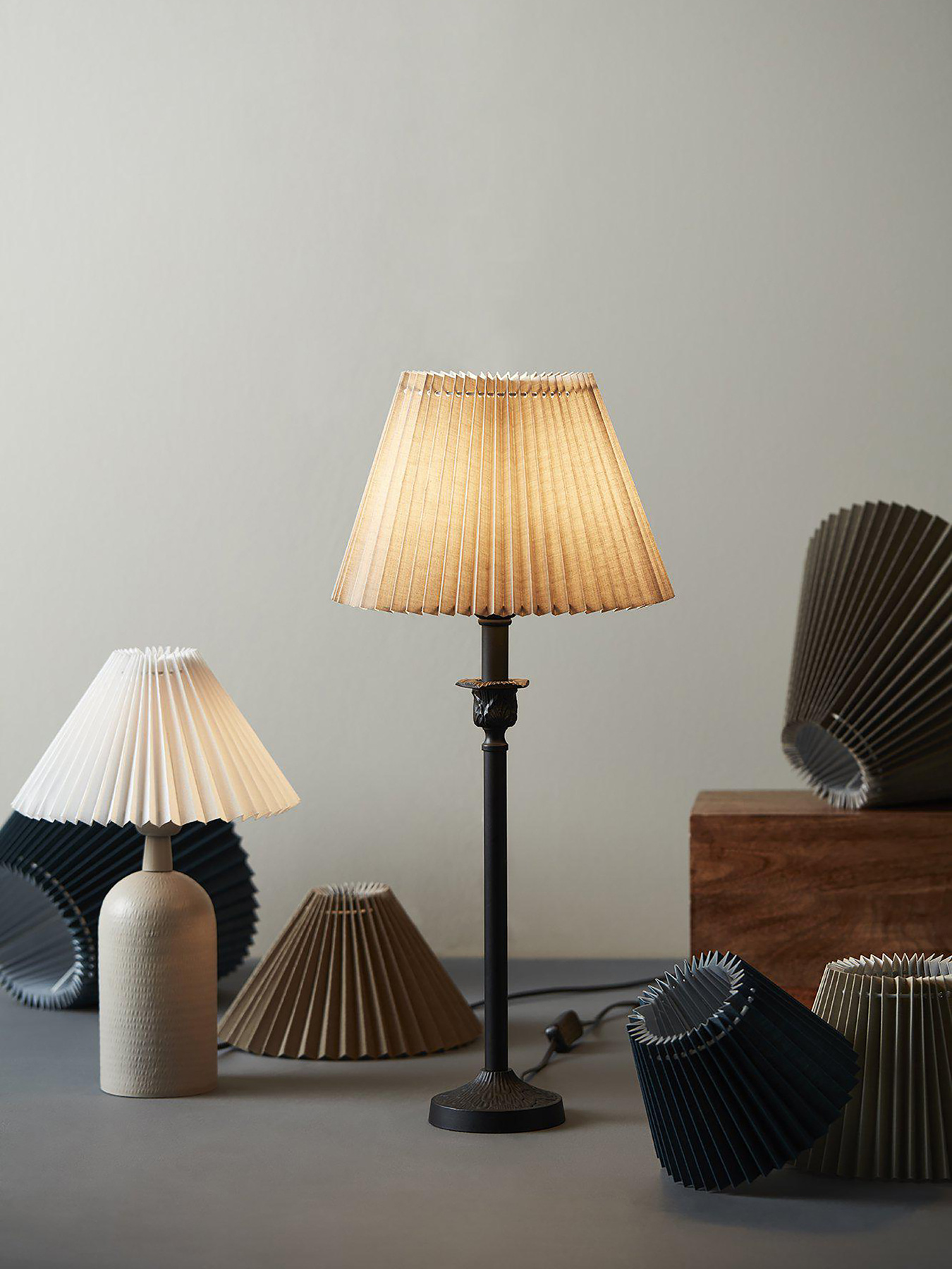 Lamp base Riley in metal with a hammered pattern. A neat contemporary table lamp that will fit in many places. Matt beige finish. Black plastic cord 170cm with switch. E27 socket. Match with shade Empire 0825 or Sofia 420 in any fabric.