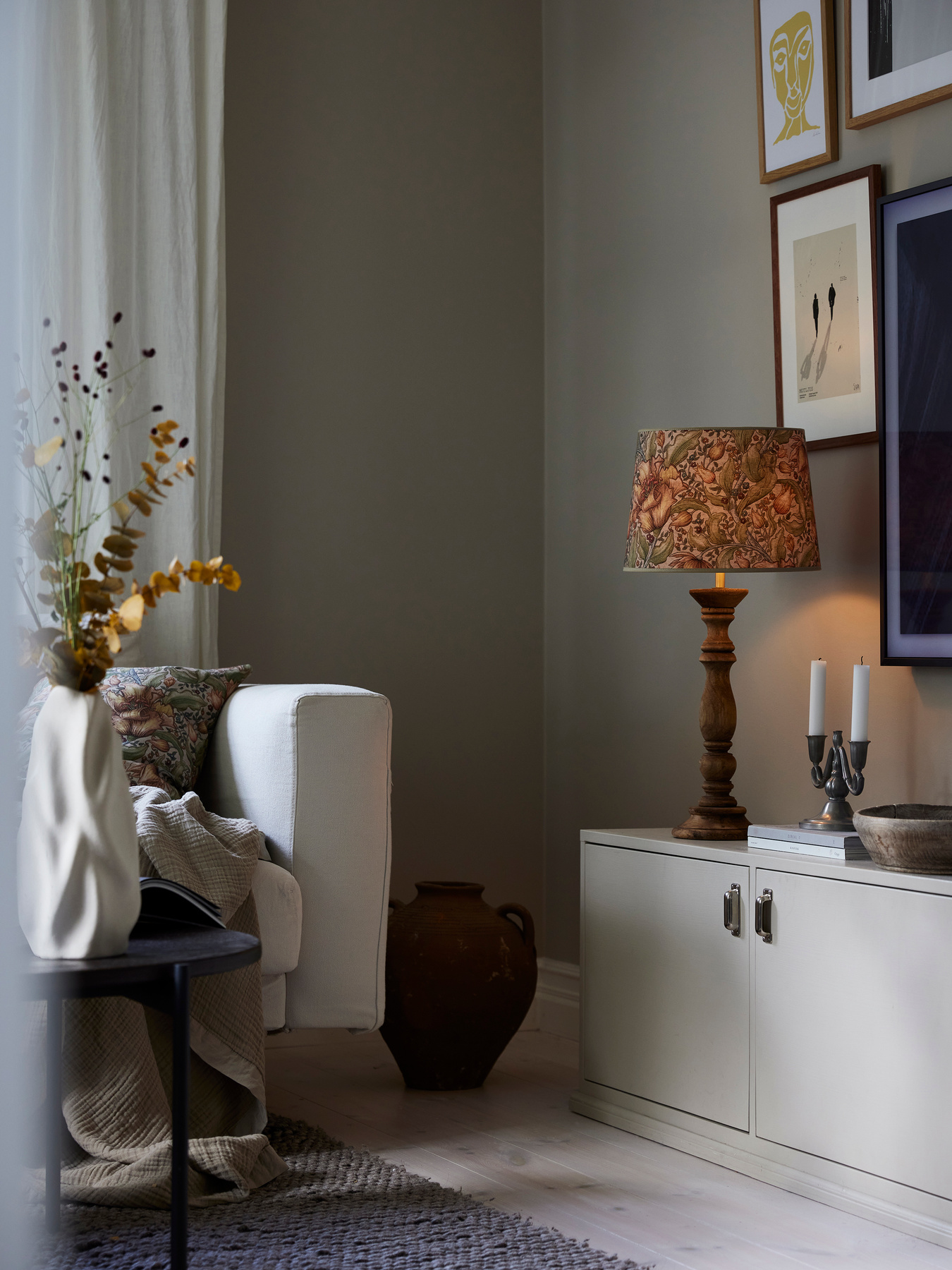 A lamp base made of wood with a beautiful design and soft shapes. Here together with Sofia lampshade with a patterned fabric from Svanefors. Thanks to its classic expression, this table lamp fits in several different homes and becomes a beautiful interior detail. The lamp base has a led lamp holder and a 2 meter long cord.