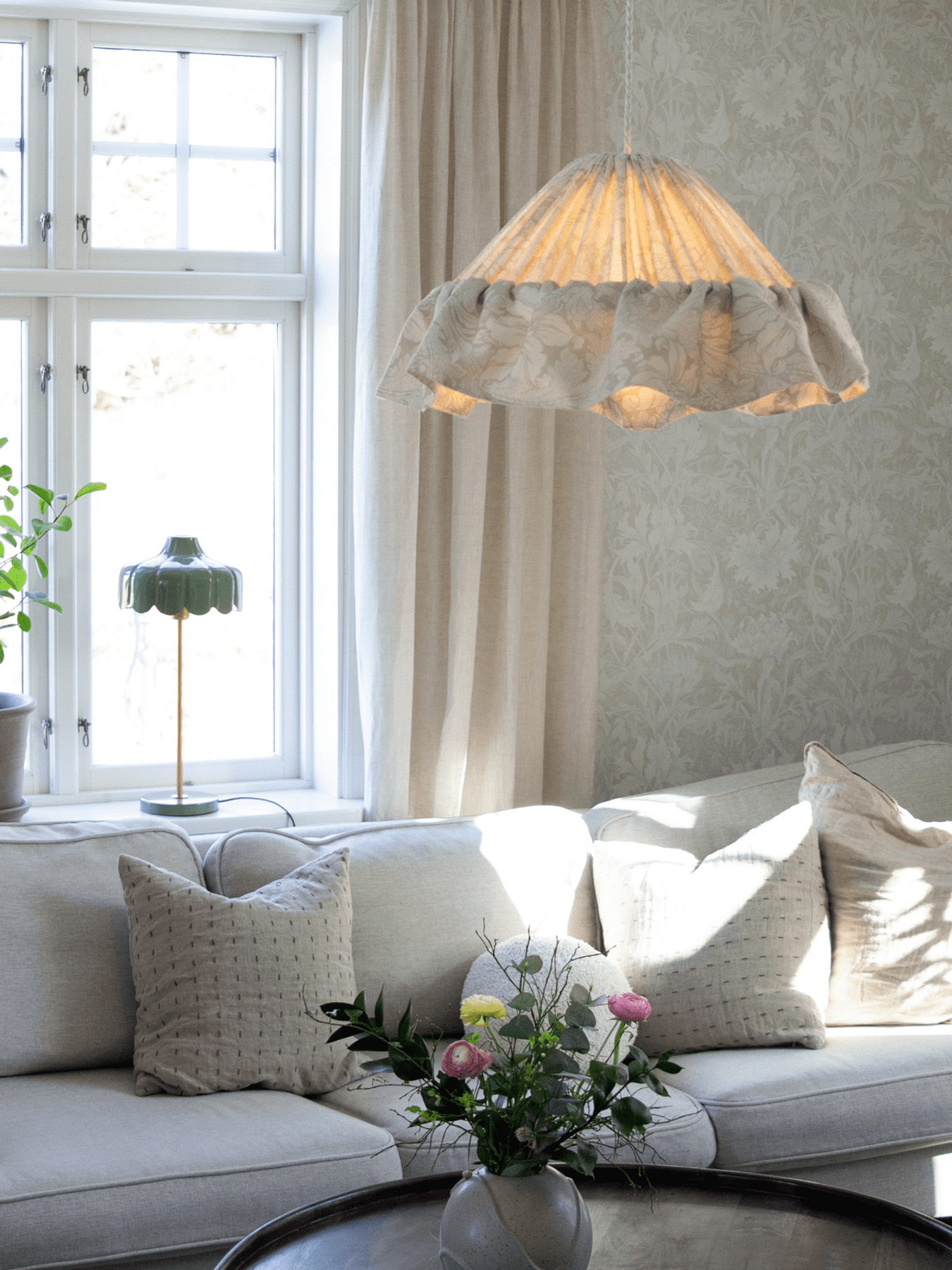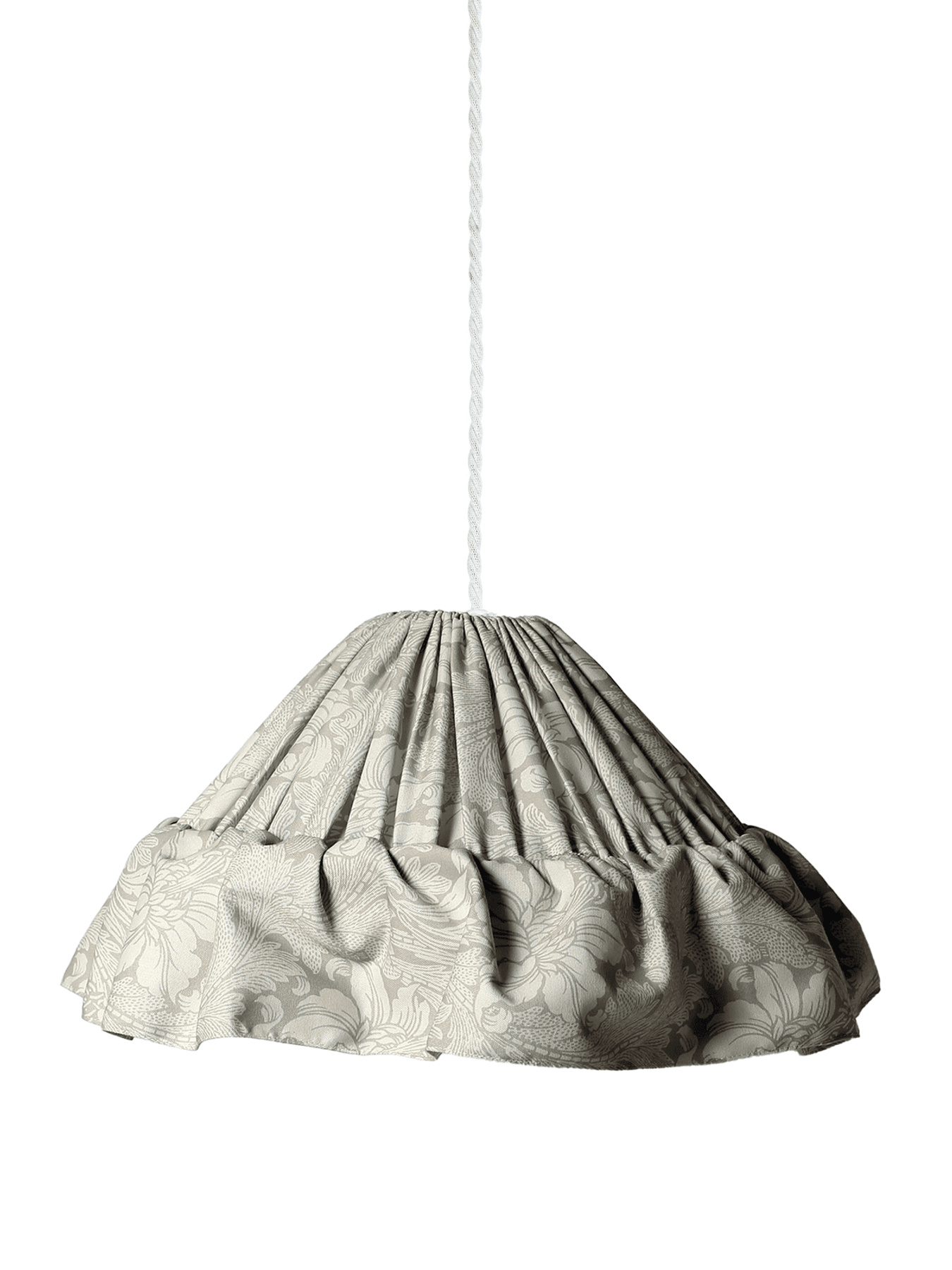 Taklampa Stina med rynkat tyg och en rynkad kjol som hänger ned och är 15cm bred. Formen på skärmen är lätt konisk. Vitt takupphänge för krokupphäng med tvinnad textilsladd. E27 lamphållare. IP20. Max 25W. Diameter 40cm nedtill, 12cm upptill, 16cm höjd. Tvinnad vit kabel med takupphäng ingår men ljuskälla måste köpas till. Vi rekommenderar en LED ljuskälla max 8W. Tyget är tryckt på 100% återvunnen polyester, tryckt i Borås. Tyget är certifierad enligt STANDARD 100 by OEKO-TEX®. Certifieringen garanterar att produkten är testad och fri från ämnen som kan vara skadliga för hälsan och miljön.