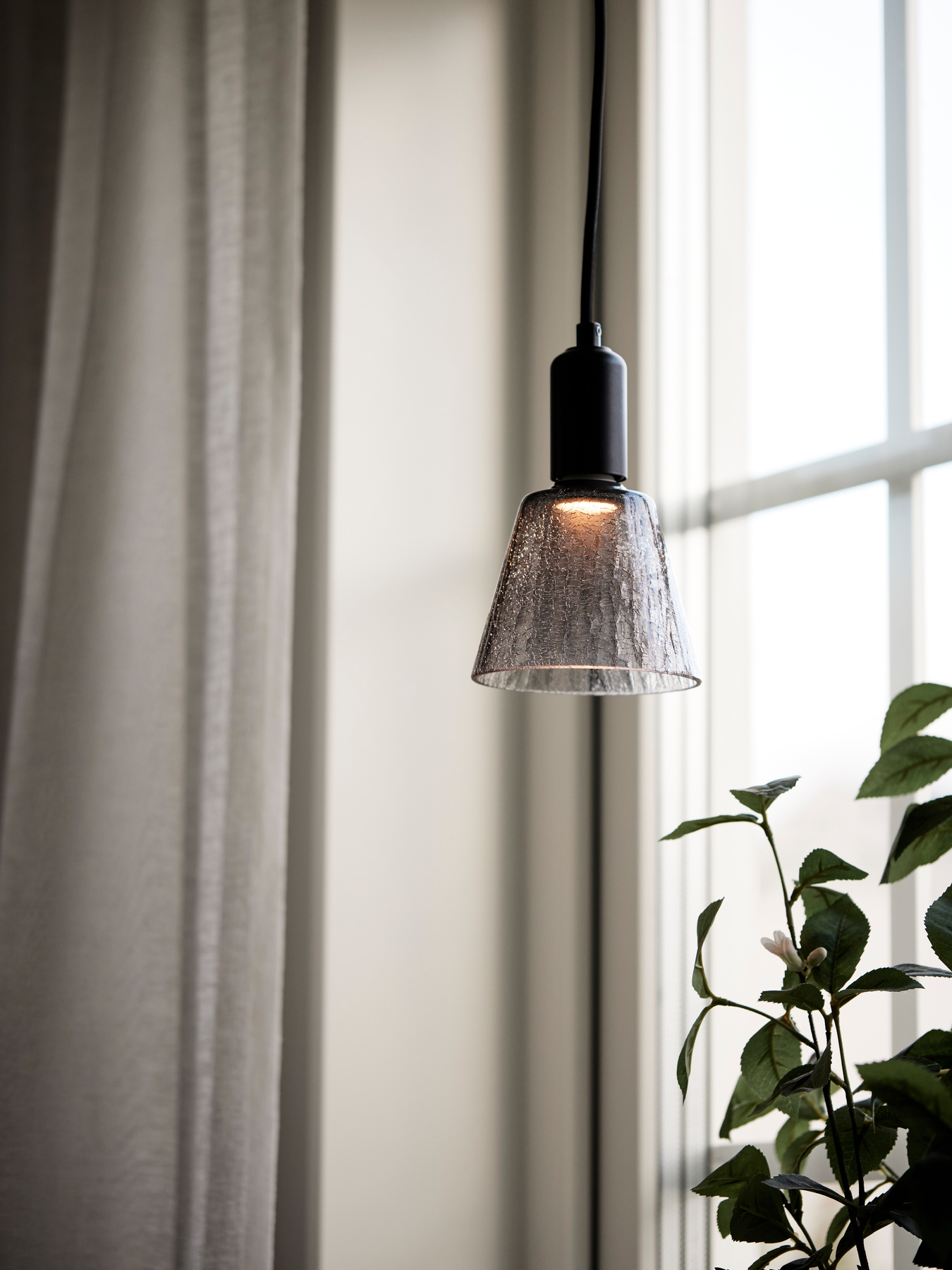 Fönsterlampa med rökfärgat glas skärm som ockå är en inbyggd LED ljuskälla och E27 sockel, 4m svart textil kabel och stickkontakt. Diameter 12,5cm. Höjd 18,5cm.