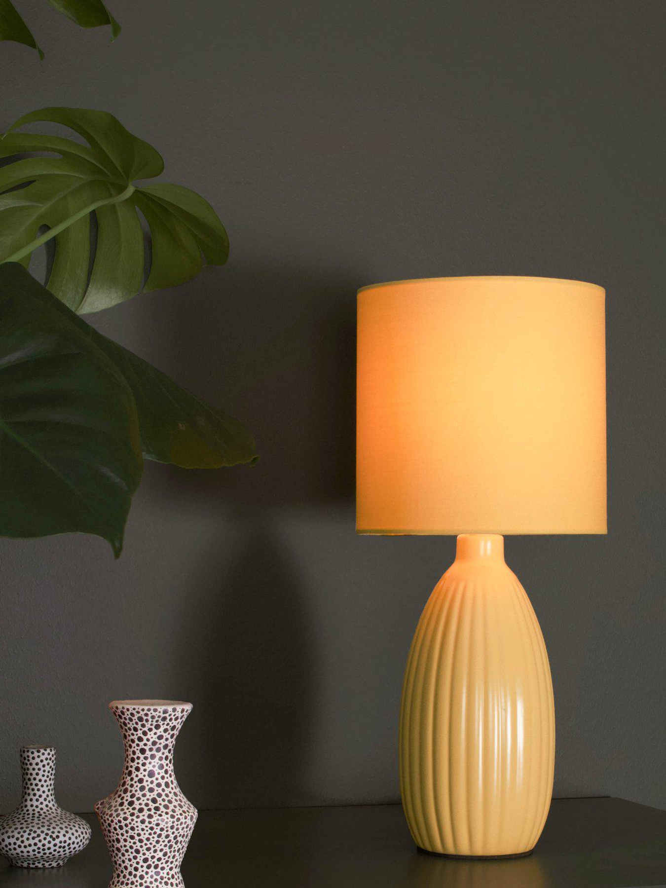 Ge ditt hem ett lyft med denna eleganta bordslampa i keramik – en tidlös inredningsdetalj som kombinerar stilren design med funktionalitet. Lampan har en cylinderformad lampskärm som är enfärgad i samma ton som foten, vilket skapar ett harmoniskt och enhetligt intryck. Med en total höjd på 37 cm och en skärmdiameter på 16 cm passar den perfekt på mindre ytor som nattduksbord, fönsterbräda eller arbetsplats.